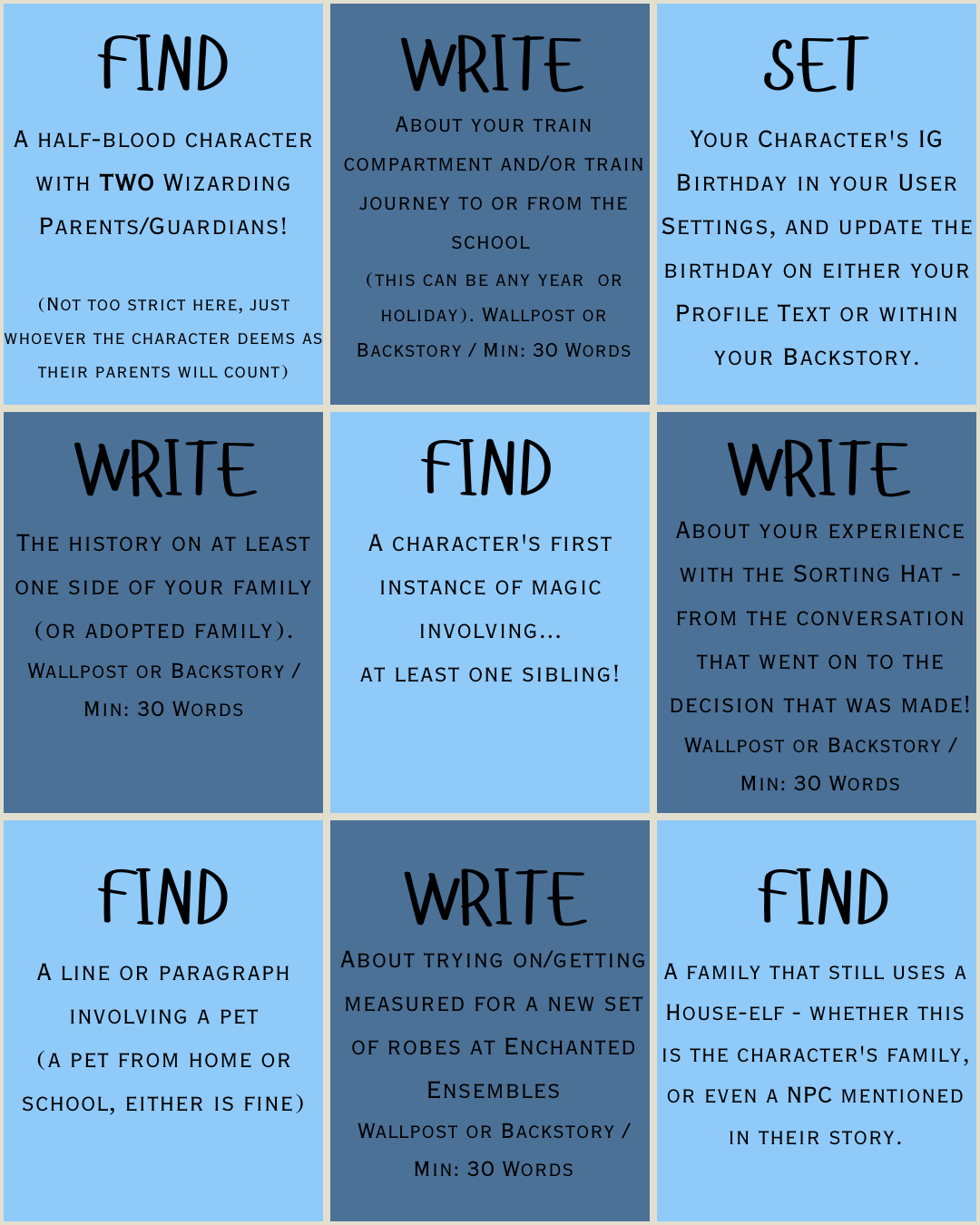 - Everything you select below must be completed after this NB is posted. If you already have backstory content relating to certain prompts, then feel free to simply add a bit more to it and it'll count as a whole. If you have done things like setting your birthday and updating it already, it may just mean you need to pick a different row, but this will still count if you haven't yet added it to your backstory/profile text (for example).